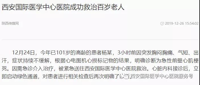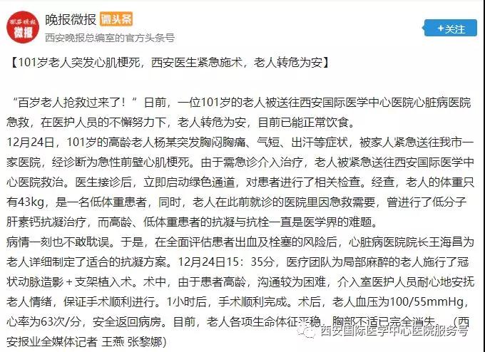 12月24日,心臟病醫(yī)院成功救治了一位101歲的老年患者。心臟病醫(yī)院CCU潘僑主任為患者在局部麻醉下行冠狀動脈造影+支架植入術(shù)。目前,患者轉(zhuǎn)危為安,已能正常飲食。