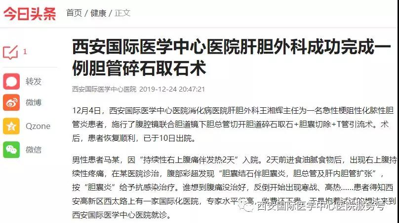 12月4日,西安國際醫(yī)學中心醫(yī)院消化病醫(yī)院肝膽外科王湘輝主任為一名急性梗阻性化膿性膽管炎患者,施行了腹腔鏡聯(lián)合膽道鏡下膽總管切開膽道碎石取石 膽囊切除 T管引流術(shù)。術(shù)后,患者恢復(fù)良好,于10日出院。