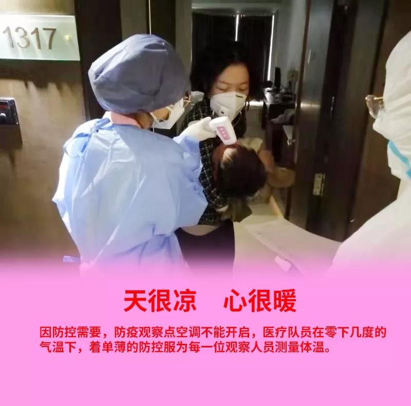 這支醫(yī)療隊(duì)由3名醫(yī)生、5名護(hù)士組成,分別是房武寧、張曉敏、王婧3位醫(yī)生;護(hù)士為白容容、陳蕓、王亞馨、燕瑞娥、田橋。身穿不透氣的防護(hù)服,醫(yī)護(hù)人員時(shí)時(shí)刻刻與時(shí)間拼耐心、與疫情變化拼細(xì)心。留觀人員中有16名70歲以上的老人,6名3歲以下的兒童。他們體質(zhì)較弱,需要更多的關(guān)懷與呵護(hù)。護(hù)士王亞馨每天要在樓上往返7、8趟為他們測體溫、安撫情緒。“我也時(shí)常想念家人,春節(jié)沒法和他們一起過年。現(xiàn)在,這里的老人和孩子就是我的家人?!闭f著,豆大的汗珠順著她的眼睫毛滑落。即便超負(fù)荷工作著,她也從未喊過苦叫過累。