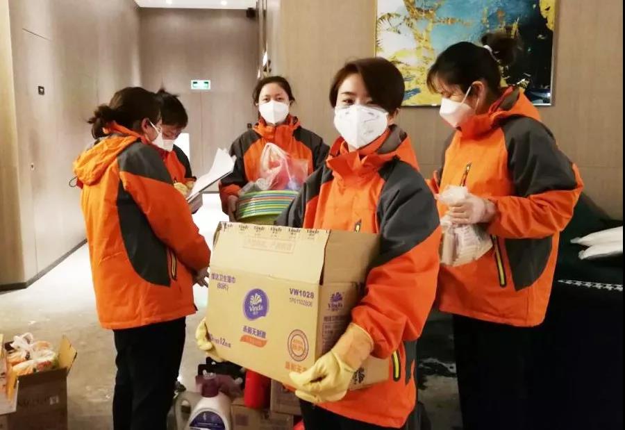 為避免人員頻繁出入,降低交叉感染風(fēng)險(xiǎn),每個(gè)樓層固定兩名工作人員,負(fù)責(zé)全樓層30多人一日三餐的收發(fā),幾十個(gè)房間的垃圾清運(yùn)處理,樓層公共區(qū)域消毒,各類生活物資清點(diǎn)搬運(yùn)分發(fā),工作量非常大!但是這些姑娘沒有人叫苦叫累,都自稱女漢子,互相加油打氣!