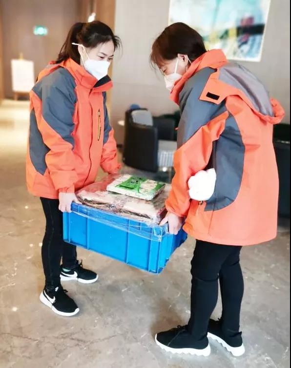 統(tǒng)一分發(fā),把飯菜送到每個(gè)房間。為了避免人員密集,駐地各樓層負(fù)責(zé)人會(huì)將飯菜從一樓集中運(yùn)送至各樓層并分發(fā)到每個(gè)人房間門口的床頭柜上。并及時(shí)通知大家食用。但由于駐地工作任務(wù)多,節(jié)奏快,很多隊(duì)員不能及時(shí)就餐,細(xì)心的姑娘們會(huì)定時(shí)檢查取餐情況,及時(shí)為隊(duì)員熱上可口的飯菜。用餐后半個(gè)小時(shí)后,她們又及時(shí)將垃圾進(jìn)行整理運(yùn)輸?shù)骄频觊T口右邊的垃圾暫存點(diǎn)。