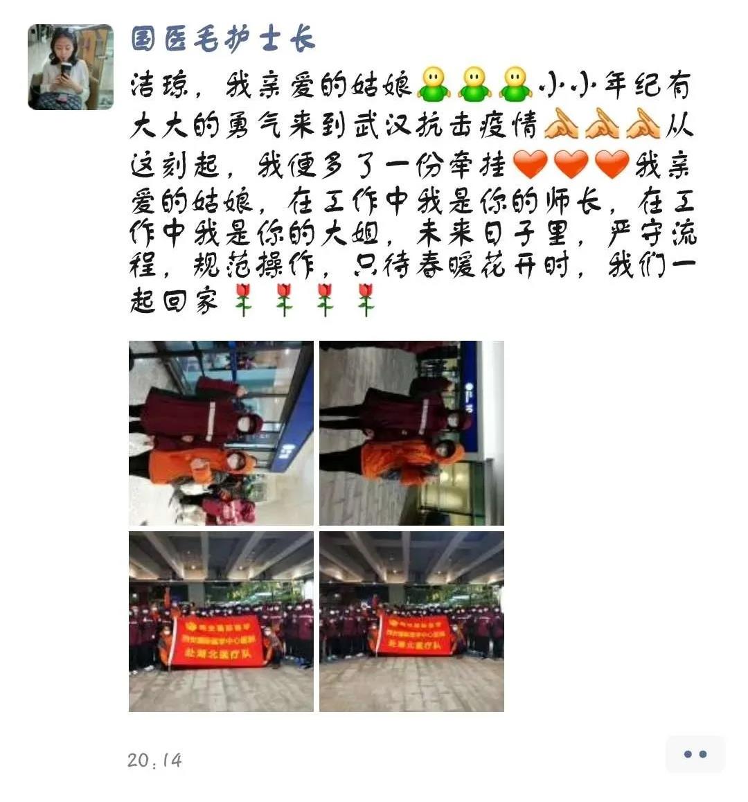 “潔瓊,我親愛的姑娘,小小年紀有大大的勇氣來到武漢,抗擊疫情,從這刻起,我便多了一份牽掛,我親愛的姑娘,在工作中我是你的師長,在生活中我是你的大姐姐,未來日子里,嚴守流程,規(guī)范操作,只待春暖花開時,我們一起回家?!边@些話中充滿了護士長對潔瓊的鼓勵、疼惜、牽掛以及對抗擊疫情必勝的信心,我親愛的戰(zhàn)士們,加油,我們與你同在。