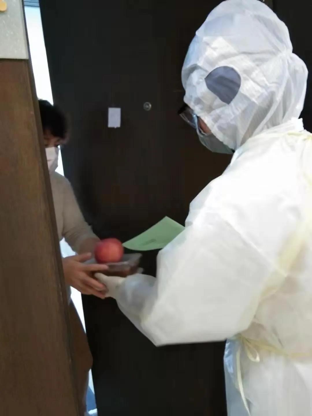 在這里的每一天,“累”是所有醫(yī)務(wù)工作者的共同感受,因?yàn)楦綦x點(diǎn)接受的大都是從武漢回來的人群,所以我們都要做好三級防護(hù)的自我保護(hù)措施。這里被隔離者都是我們的親人,生活起居,心理輔導(dǎo),事無巨細(xì)都由我們照料。記得剛來的那幾天,穿著不透氣的隔離衣給留觀者送餐時(shí),送到一半時(shí)突然感覺自己呼吸不暢,后面的衣服都濕透了,怕自己撐不住,趕快跑到安全通道脫下面罩,解開隔離衣,那一刻好想休息片刻,但是看著箱子里的飯菜,我又重新穿起了隔離衣。我的放松會讓飯菜變涼,家人們吃了會不舒服。想到這里,我邁出堅(jiān)定的步伐,加入到戰(zhàn)斗中。