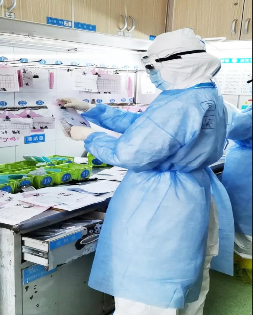 一線臨床的治療和護(hù)理工作,是真正考驗技術(shù)的環(huán)節(jié)。加藥配藥嚴(yán)格無菌操作、雙人核對。戴著多層防護(hù)手套工作,一雙“大手”小心翼翼拿取每一小支安瓿抽吸藥液時稍顯笨拙,但是護(hù)士說:“現(xiàn)在加藥的姿勢可能有點狼狽,但是我沒有浪費一滴藥,這都是在科室練出來的基本功?!?/span>