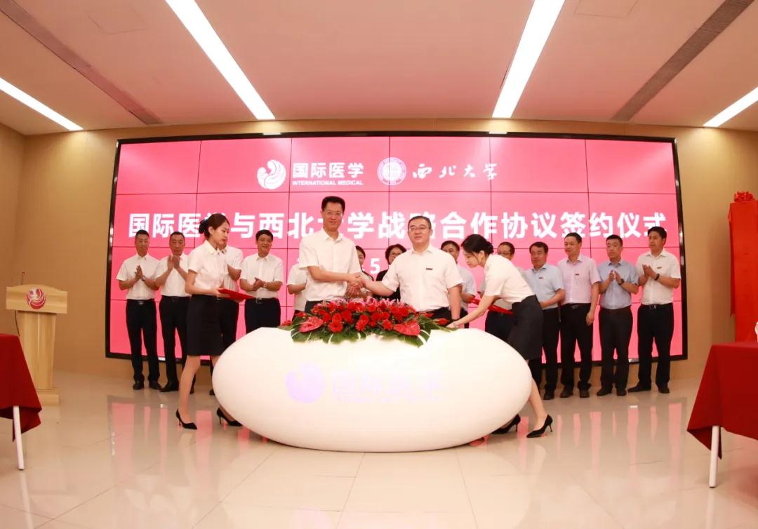 5月24日上午,國際醫(yī)學(xué)與西北大學(xué)戰(zhàn)略合作協(xié)議簽署暨西北大學(xué)附屬醫(yī)院授牌及揭牌儀式在西安國際醫(yī)學(xué)中心融媒體中心熱烈舉行。陜西省衛(wèi)健委主任劉寶琴、西北大學(xué)黨委書記王亞杰、黨委常委、副校長常江、生命科學(xué)與醫(yī)學(xué)部教授趙鋼;國際醫(yī)學(xué)實際控制人劉建申、董事長史今、黨委書記、總裁劉瑞軒等領(lǐng)導(dǎo)出席儀式。劉瑞軒總裁主持儀式。
