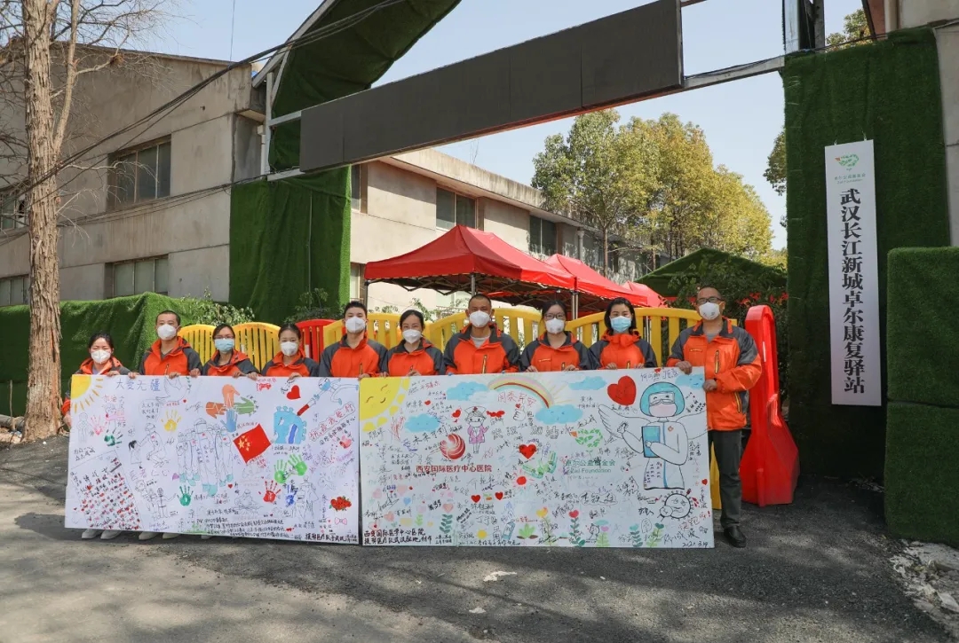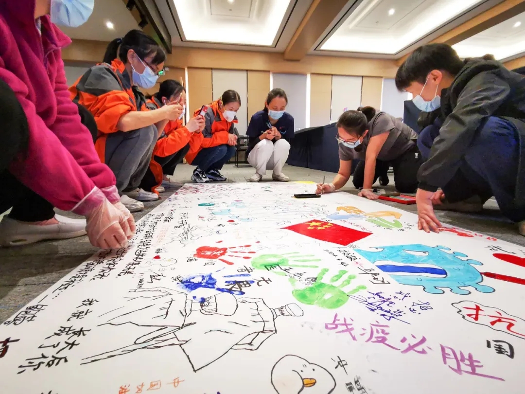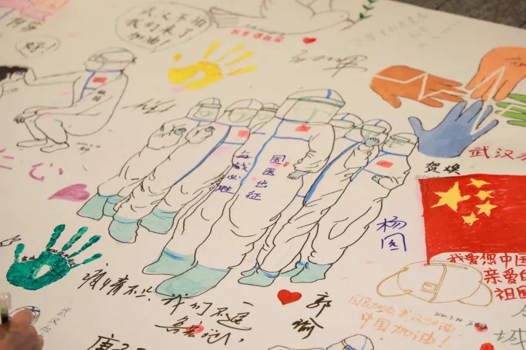 這兩幅畫板由醫(yī)療隊(duì)員和駐地的志愿者共同創(chuàng)作,一支支畫筆繪出全體人員戰(zhàn)“疫”祝福心聲:“武漢加油,中國(guó)必勝。”