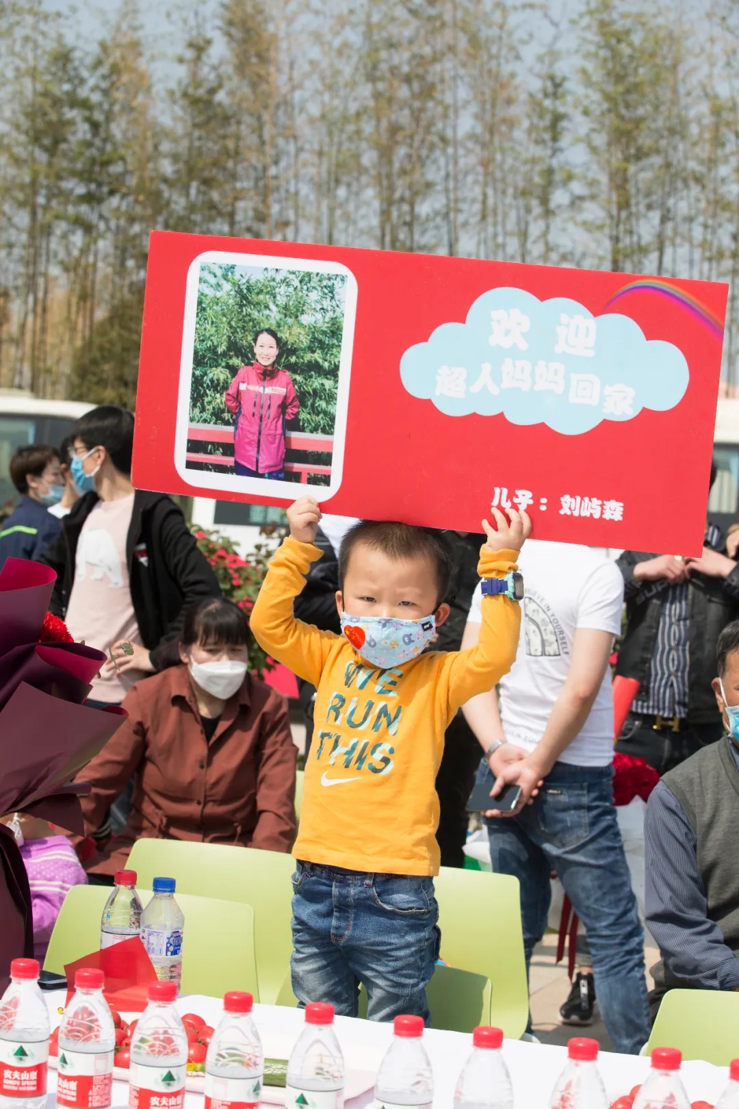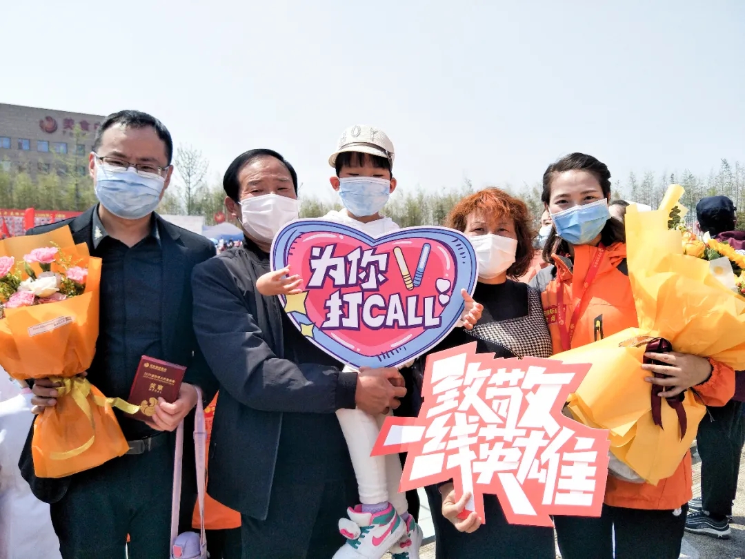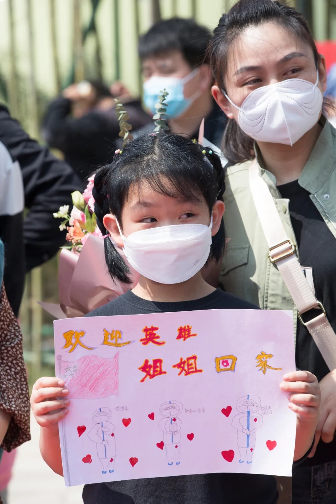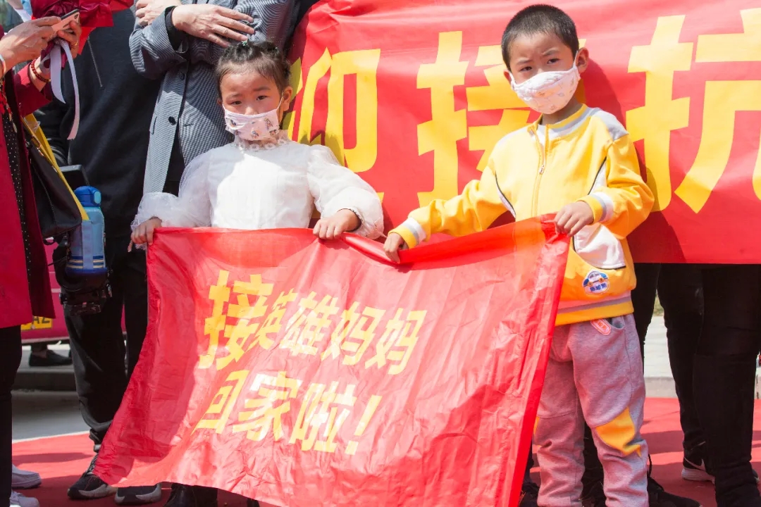 “歡迎媽媽回家!”“致敬一線英雄!”“為你打CALL”人群中,孩子們手持歡迎牌,呼喊著。