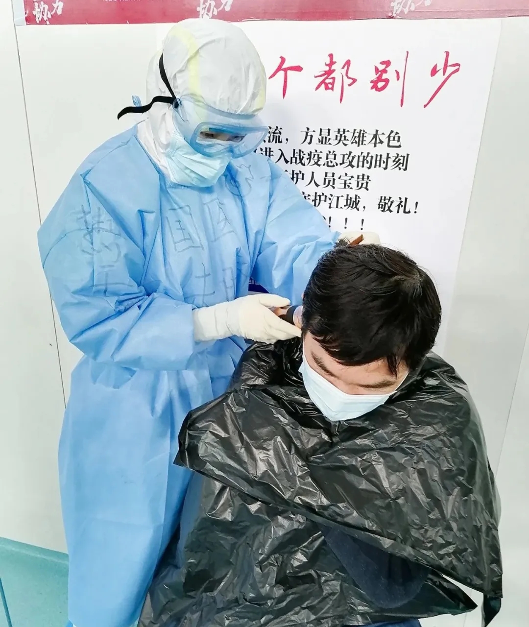 1艙有康復(fù)人員想理發(fā),手頭沒(méi)有工具,朱晴護(hù)士長(zhǎng)得知后,聯(lián)系下個(gè)班次護(hù)士帶來(lái)推子,給大家理發(fā)?!翱茨銊?dòng)作很嫻熟啊,以前練過(guò)的吧”,“圍觀群眾”打趣道?!艾F(xiàn)學(xué)現(xiàn)賣(mài),大家要求不要太高,有壓力啊!”朱晴說(shuō)。一直推到推子沒(méi)電,朱晴給6位康復(fù)人員簡(jiǎn)單修剪了頭發(fā)。得知朱晴是西安醫(yī)療隊(duì)的護(hù)士,大家都親切的稱她“肉夾饃”!
