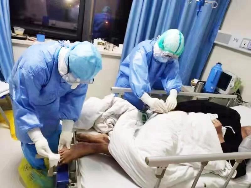 每名隊(duì)員穿著厚重的防護(hù)衣,來(lái)回穿梭在戰(zhàn)斗的最前線。病區(qū)沒(méi)有陪護(hù),又以高齡老年行動(dòng)不便的患者居多,都佩戴鼻氧管或者儲(chǔ)氧面罩,更有甚者佩戴無(wú)創(chuàng)呼吸機(jī)。護(hù)理人員不僅要不停地巡視病房,更要協(xié)助病人在床上大小便,為患者翻身、送飯、打水,要服藥到口,測(cè)量生命體征等。時(shí)間久了,護(hù)目鏡里全都是水,這樣就對(duì)靜脈采血和留置針穿刺成功率帶來(lái)了難度,他們憑借著扎實(shí)的專業(yè)技術(shù)功底和多年的臨床經(jīng)驗(yàn),一次又一次的一針見(jiàn)血,每班下來(lái),每個(gè)人內(nèi)穿衣已經(jīng)全部濕透,臉上被壓的滿是皺褶,這樣的場(chǎng)景對(duì)他們來(lái)說(shuō),再平常不過(guò)。