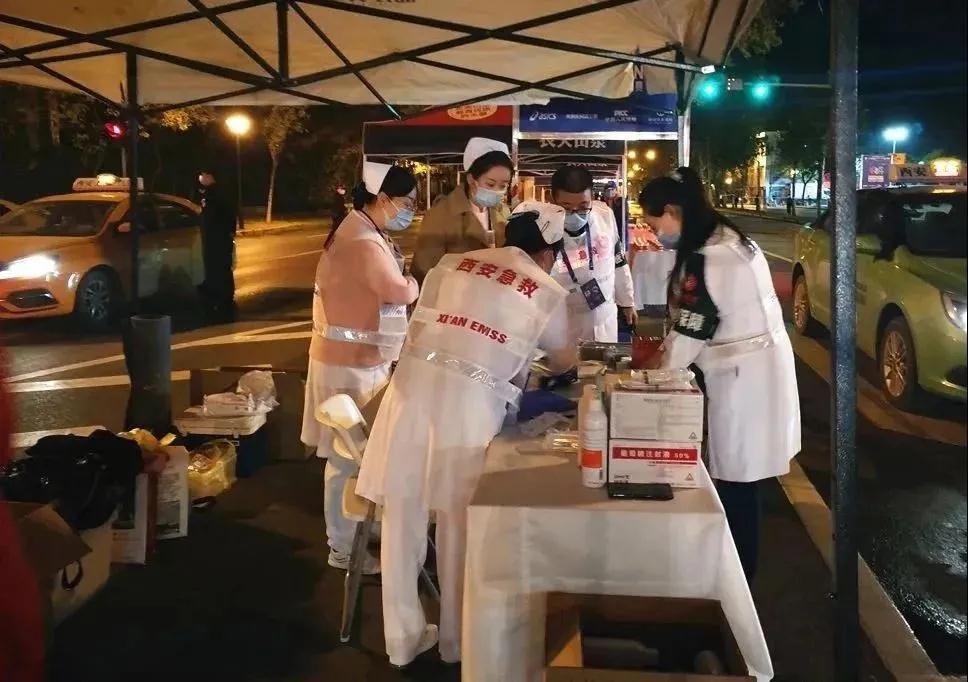 凌晨4點,醫(yī)療保障組分成3隊,分乘4輛車從醫(yī)院統(tǒng)一出發(fā)前往賽事現(xiàn)場。到達指定地點后,團隊立刻按照前期演練分工進行相關(guān)準備工作。7點30分,2020西安國際馬拉松正式鳴槍開跑,現(xiàn)場保障人員及時響應,積極救助受傷參賽選手,專業(yè)的技術(shù)和溫馨的言語,讓受傷的的選手們感到溫暖。