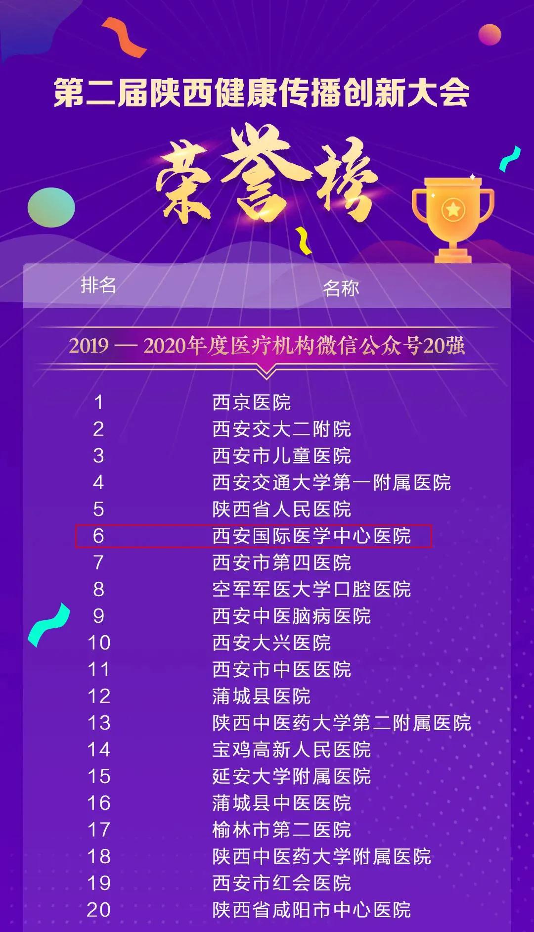 11月25日,由陜西省衛(wèi)生健康委員會(huì)、陜西省醫(yī)師協(xié)會(huì)指導(dǎo),陜西醫(yī)療自媒體聯(lián)盟、陜西省衛(wèi)生健康干部培訓(xùn)中心承辦的第二屆陜西健康傳播創(chuàng)新大會(huì)在西安召開。西安國際醫(yī)學(xué)中心醫(yī)院微信公眾號(hào)榮獲2020年陜盟醫(yī)療機(jī)構(gòu)微信公眾號(hào)第六名。