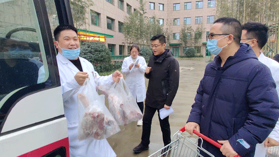 當(dāng)日上午,蒙古國(guó)捐贈(zèng)的486箱冷凍羊乘“接運(yùn)專車(chē)”到達(dá)陜西西安。按照國(guó)家統(tǒng)一部署,羊經(jīng)過(guò)嚴(yán)格檢驗(yàn)檢疫加工后轉(zhuǎn)運(yùn)陜西省,分配給前往湖北參與新冠肺炎疫情醫(yī)療救治工作的醫(yī)療隊(duì)員。我院收到100箱捐贈(zèng)羊。下午五點(diǎn),張良院長(zhǎng)助理帶領(lǐng)綜合辦公室工作人員,將一袋袋羊肉發(fā)到醫(yī)療隊(duì)隊(duì)員們手中。