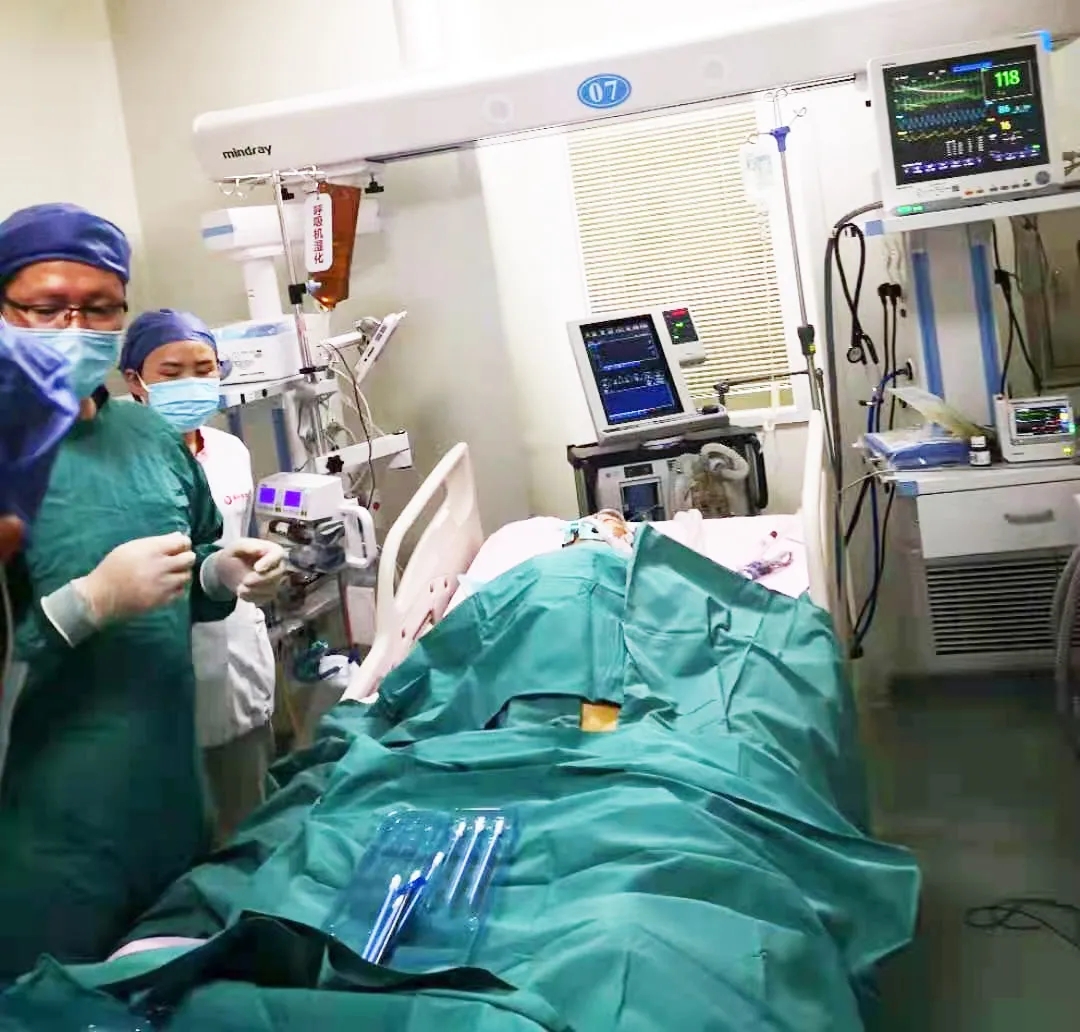 時(shí)間就是生命,治療設(shè)備第一時(shí)間到位后,胸科醫(yī)院吳昌歸院長(zhǎng)、呼吸內(nèi)科重癥監(jiān)護(hù)室陳麗展主任、心外科程亮主任、程維平醫(yī)生等人立刻開(kāi)始緊張的搶救工作。醫(yī)護(hù)人員一邊進(jìn)行動(dòng)靜脈置管并連接VV-ECMO的管路,一邊進(jìn)行抗感染、輸血、維持生命體征,吸痰等營(yíng)養(yǎng)支持治療。直到入院次日下午3點(diǎn)左右,患者病情趨于穩(wěn)定,搶救才告一段落。在醫(yī)護(hù)人員的精心治療下,患者病情逐漸好轉(zhuǎn),13天后成功脫離體外膜肺、停用VV-ECMO,16天后拔除氣管插管,能夠清楚的和人溝通交流,恢復(fù)情況讓醫(yī)護(hù)興奮,更讓家屬激動(dòng)不已。