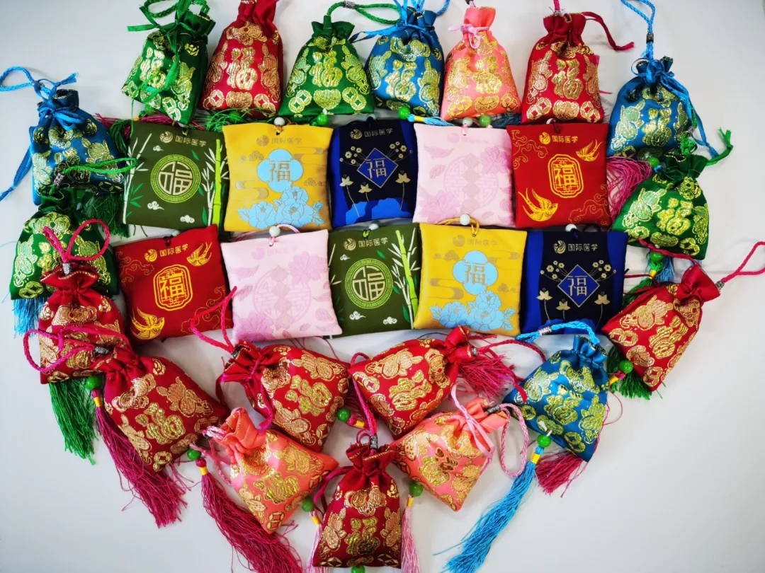 西安國(guó)際醫(yī)學(xué)中心醫(yī)院中藥房為您準(zhǔn)備了端午香囊,內(nèi)含蒼術(shù)、白芷、冰片、藿香和艾葉等多種香藥,有辟穢、燥濕、醒神的功效。這款端午香囊富涵植物藥香,甘涼舒適,濃郁不膩??梢耘宕饔谏砩?,或者懸掛車內(nèi)、房間、背包等處使用。