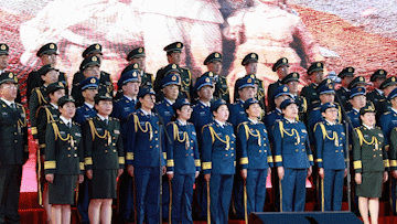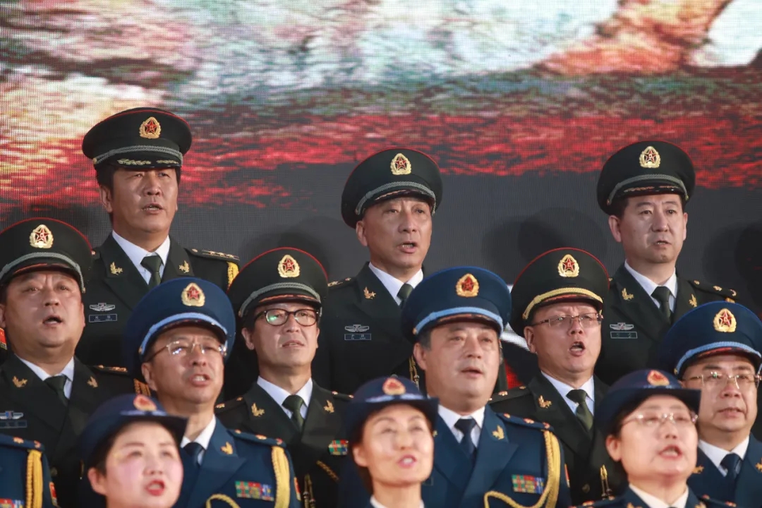 “我是一個兵,來自老百姓……”合唱將《我是一個兵》《沒有共產(chǎn)黨就沒有新中國》巧妙編排在一起?!段沂且粋€兵》鏗鏘有力,氣勢高亢,展示了老兵們永不褪色的軍人風(fēng)采;隨著中國人民解放軍進(jìn)行曲響起,三名軍旗手,邁著堅實的步伐走上舞臺;“沒有共產(chǎn)黨就沒有新中國,沒有共產(chǎn)黨就沒有新中國……”激情高昂的歌聲表達(dá)出每一個人的心聲,合唱融入了京劇唱法,男聲鏗鏘有力,氣勢十足,女聲委婉細(xì)膩,優(yōu)美動聽,極富有感染力,將整場氣氛推向高潮,贏得全場陣陣掌聲。