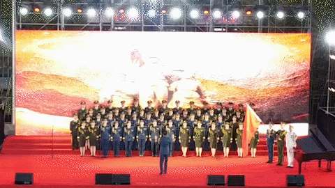 “一二一”,演出開始,由71名退役軍官組成的退役軍人合唱團,在尹強院長的帶領(lǐng)下,邁著整齊的步伐,喊著響亮的口號,雄赳赳,氣昂昂走上舞臺。