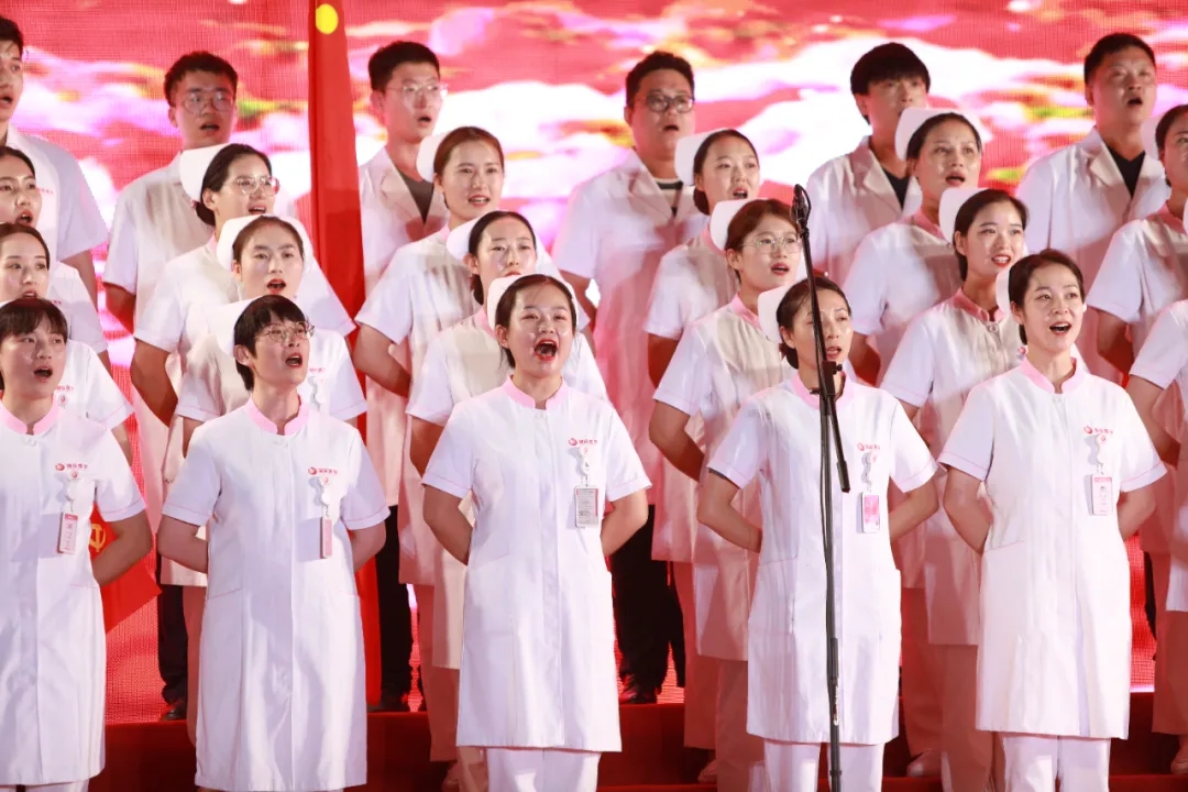 “夜半三更喲盼天明,寒冬臘月喲盼春風(fēng)……”合唱團用歌聲抒發(fā)對偉大祖國的深深至愛,傾訴對醫(yī)學(xué)事業(yè)的拳拳之情。在領(lǐng)唱的帶領(lǐng)下,大家分男女聲部進(jìn)行輪唱,群情激昂,歌聲嘹亮。在全場的掌聲中,大家揮舞起手中的黨旗,抒發(fā)對祖國的熱愛。