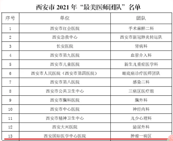 西安市衛(wèi)健委表彰了西安市2021年“最美醫(yī)師團(tuán)隊(duì)”、“最美醫(yī)師”。腫瘤一病區(qū)榮獲西安市2021年“最美醫(yī)師團(tuán)隊(duì)”,胸科醫(yī)院韓新鵬、腦科醫(yī)院馬濤榮獲西安市2021年“最美醫(yī)師”。