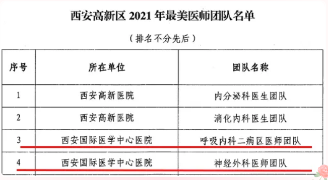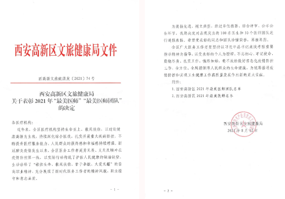 西安高新區(qū)文旅健康局表彰了西安高新區(qū)2021年最美醫(yī)師團(tuán)隊(duì)、最美醫(yī)師。呼吸內(nèi)科二病區(qū)醫(yī)師團(tuán)隊(duì)、神經(jīng)外科醫(yī)師團(tuán)隊(duì)榮獲西安高新區(qū)2021年最美醫(yī)師團(tuán)隊(duì),董文婷、常亮、楊磊、張安生榮獲西安高新區(qū)2021年最美醫(yī)師。