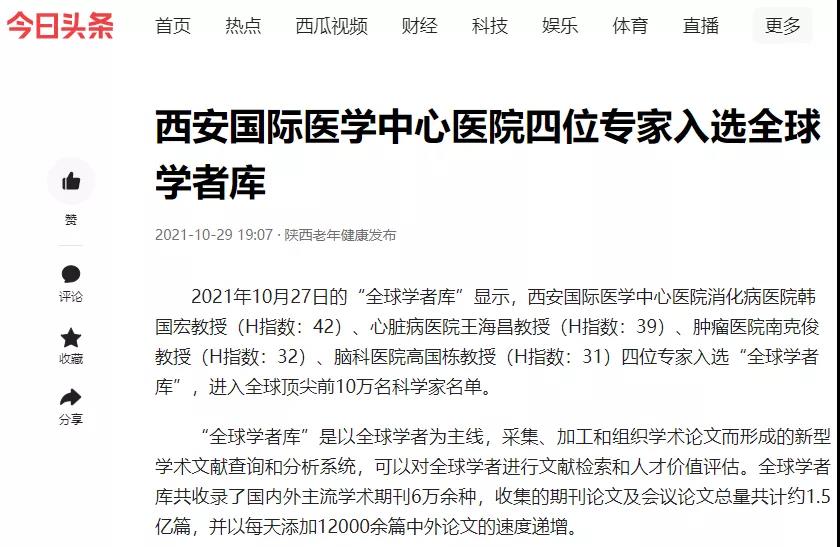 西安國際醫(yī)學中心醫(yī)院四位專家入選全球?qū)W者庫