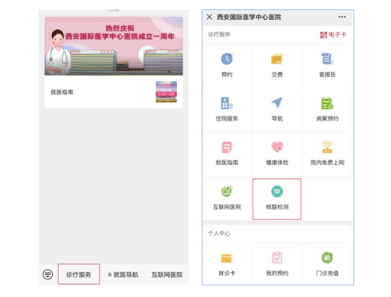 醫(yī)院核酸檢測已開通線上預(yù)約,大家可通過“西安國際醫(yī)學(xué)中心醫(yī)院服務(wù)號”微信公眾號進行預(yù)約。