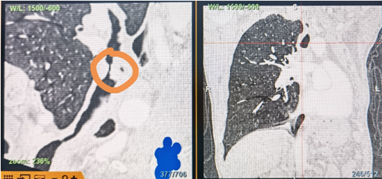 時(shí)間就是生命!了解患者病情后,歐陽(yáng)海峰立刻啟動(dòng)氣道梗阻緊急救治通道,協(xié)調(diào)院前轉(zhuǎn)運(yùn),急診快速入院流程。凌晨患者入院胸部CT顯示,現(xiàn)存唯一的呼吸通道在右主支氣管處,狹窄處僅約3毫米,患者命懸一線!