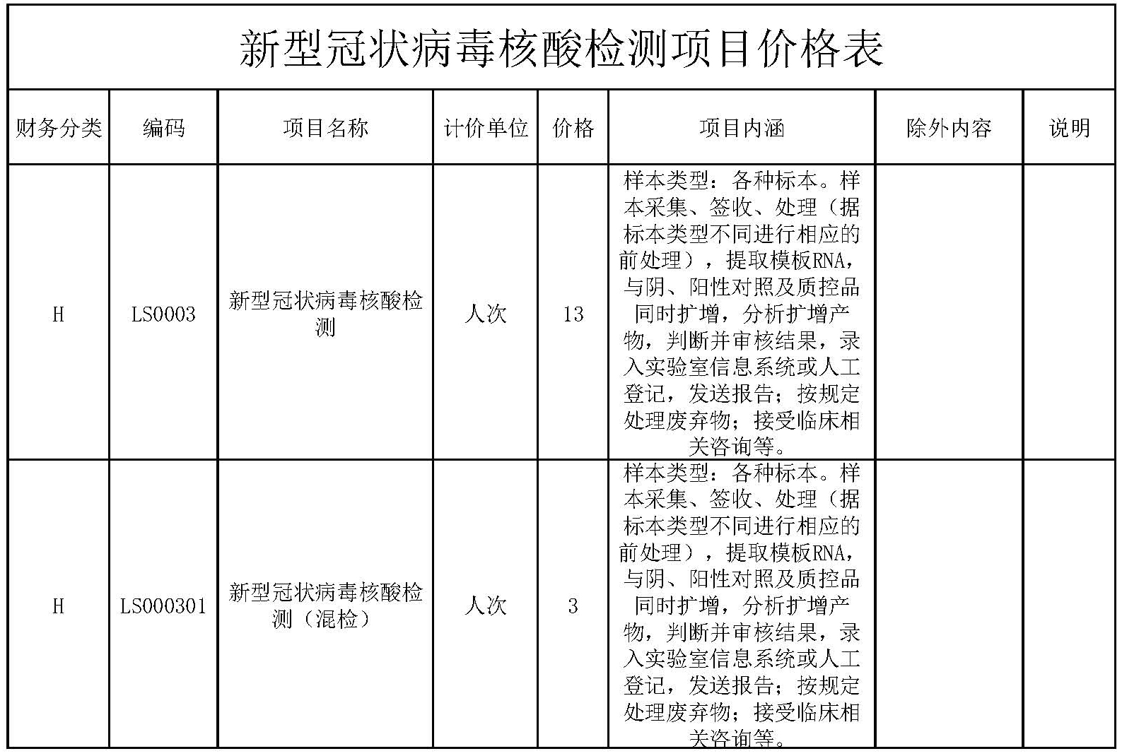 新型冠狀病毒核酸檢測項目價格表
