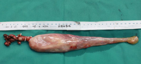 手術(shù)刀游走在人體血管的江河湖海,在完全游離肝臟顯露全段下腔靜脈后,依次有序阻閉“主干道”的血流供應(yīng),最后阻斷肝臟血供,于肝臟尾狀葉肝短靜脈下方切開下腔靜脈,借助經(jīng)食管超聲實時嚴(yán)密的監(jiān)控,經(jīng)下腔靜脈切口順利取出位于右心房、膈上下腔靜脈、肝后下腔靜脈內(nèi)的瘤栓,隨即阻閉膈下腔靜脈,同時恢復(fù)肝臟血流“通航”。手術(shù)刀繼續(xù)向下行進,一點一點地剝離下腔靜脈遠心段直至右側(cè)髂總靜脈、右側(cè)髂內(nèi)靜脈內(nèi)的瘤栓,最終,一根長達35cm、最寬直徑5cm的腔靜脈瘤栓被完整取出!
