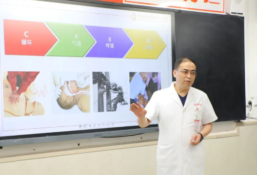 西安國際醫(yī)學(xué)中心醫(yī)院麻醉手術(shù)中心副主任王彬榮以“基礎(chǔ)生命支持”為主題,給老師們?cè)敿?xì)介紹了現(xiàn)場急救、復(fù)蘇的定義和基本流程,并進(jìn)行現(xiàn)場演示。