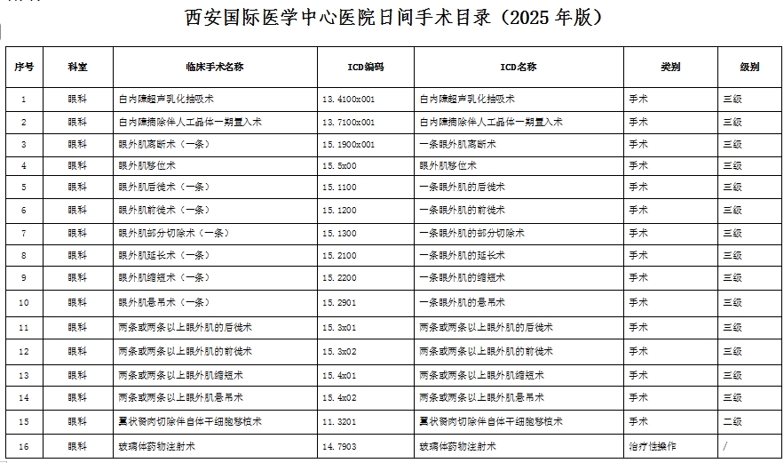 為進一步加強本院日間診療管理,規(guī)范日間診療服務行為,保障日間醫(yī)療質量與安全,按照《醫(yī)療機構日間醫(yī)療質量管理暫行規(guī)定》、《手術質量安全提升行動方案(2023—2025年)》、《提升醫(yī)療質量安全行動計劃(2023-2025年)》等各類文件要求,現(xiàn)將本院2025年度日間手術目錄公示如下: